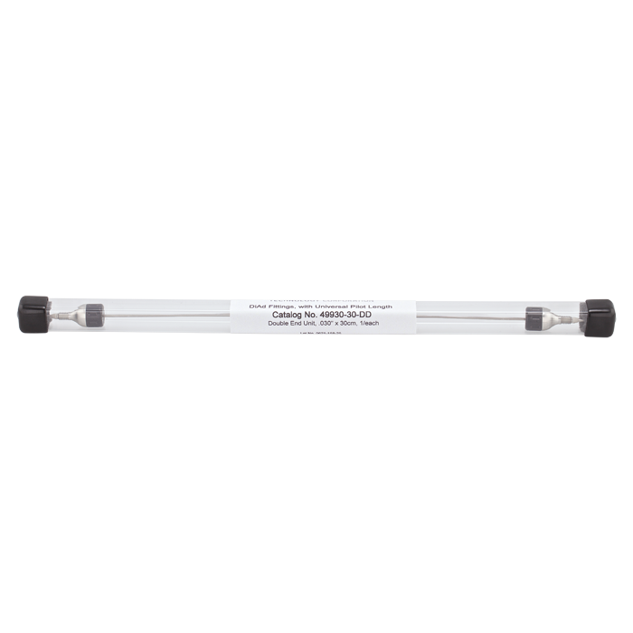 This Di-Ad™ is very convenient for laboratories that use multiple column brands and want to use 0.030" (762um) ID x 300mm (11.81") long tubing with perfect cut tips. Pressure rating for these connectors is 10,000 psi and are HPLC solvent resistant.