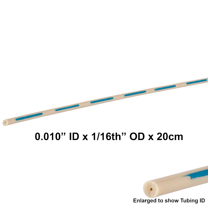 Tubing, PEEK, Pre-Cut, 0.010 inch (0.25 mm) ID, 1/16th inch (1.6 mm) OD, Ultra-T grade, blue intermittent stripes, 20 cm long (+/- 1 mm). ARE-Applied Research brand. 5 PK.