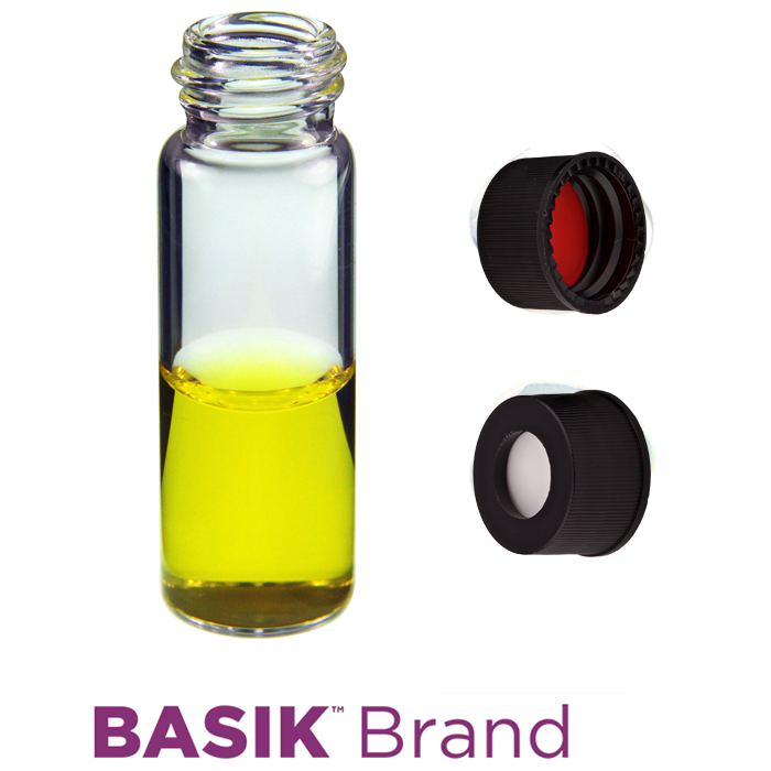 Vial & Cap Kit Includes 100 EA 4ml, Screw Top, Clear Autosampler Vials and 100 EA matching Screw Caps with Silicone Rubber / PTFE Septa, fitted in the Black Caps, BASIK Brand Easy Purchase Pack. 1/PK.