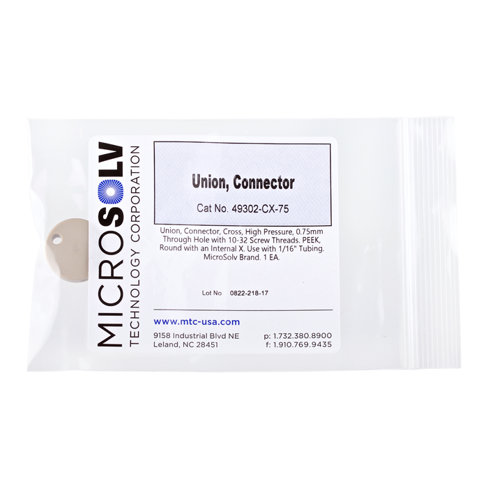 This low dead volume, "Union" is used to connect PEEK or stainless steel tubing with the same connectors on both ends in the high pressures zones of HPLC systems. A "Cross (X)" internal flow pattern is often used to split flow into two or three directions or to combine two or three streams into one.