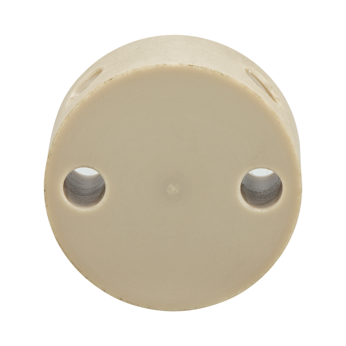 Union, Connector, Cross, high pressure, 0.75 mm / 0.030 inch through hole with 10-32 screw threads. PEEK, round with an internal "X" flow pattern. ARE-Applied Research brand. Bulk Price.