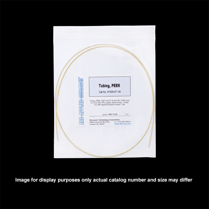 Tubing, PEEK, 0.007 inch (0.18 mm) ID, 1/16th inch (1.6 mm) OD, HPLC grade, yellow stripe, 3 meter roll, ARE-Applied Research brand. 1 EA.