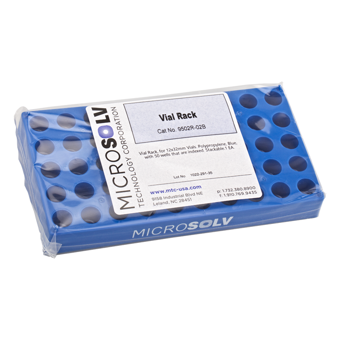 Vial Rack, for 12x32mm, 2ml autosampler vials. polypropylene, blue, with 50 wells that are indexed. Stackable. MicroSolv brand. 1 EA.