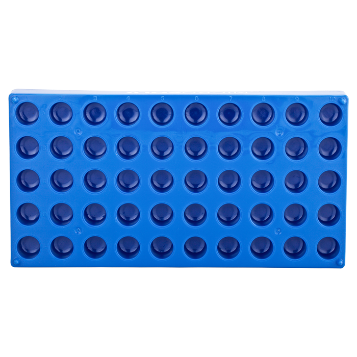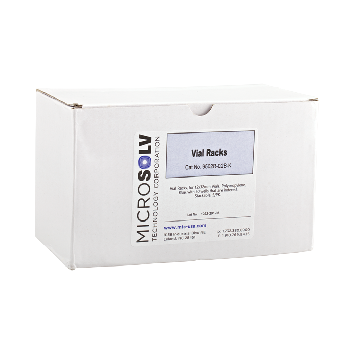 Vial Racks, for 12x32mm, 2ml autosampler vials. Polypropylene, blue, with 50 wells that are indexed. Stackable. MicroSolv brand. 5/PK.