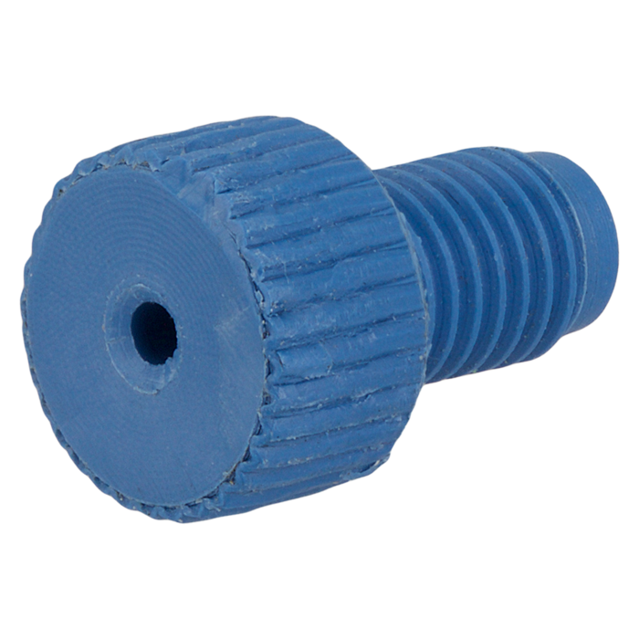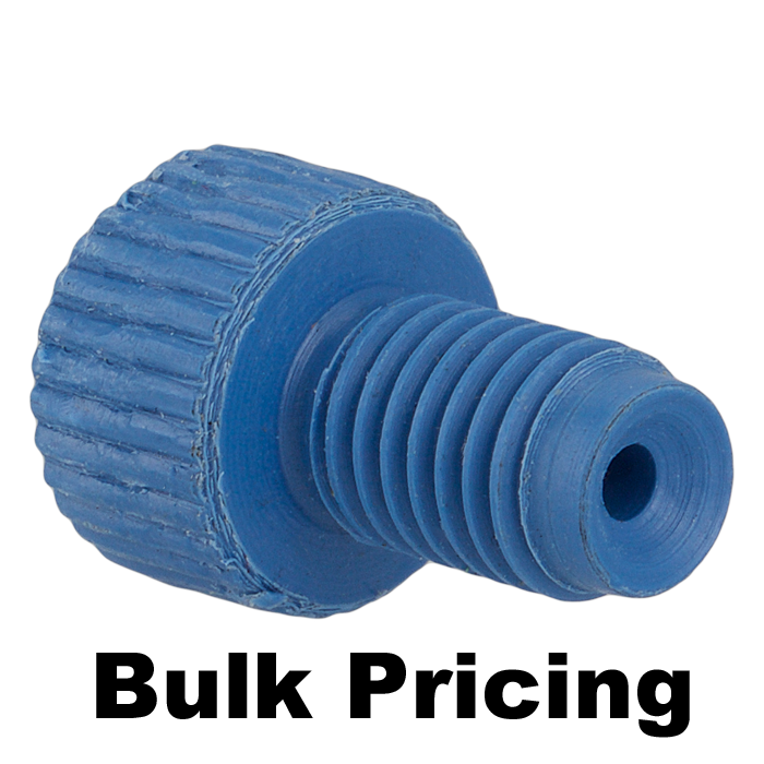 Tubing Connector Nuts, low pressure, 1/16 inch, PEEK, Blue with 1/4-28 screw threads, for use with flange free, polymeric tubing. ARE-Applied Research brand. Bulk Price.