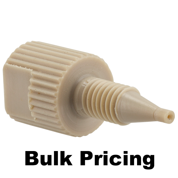 This finger tightened adapter makes changing from a standard 10/32 threaded female port to a 1/4-28 very convenient. This all-PEEK adapter has a standard male connector with a built-in ferrule with a "universal" pilot length.