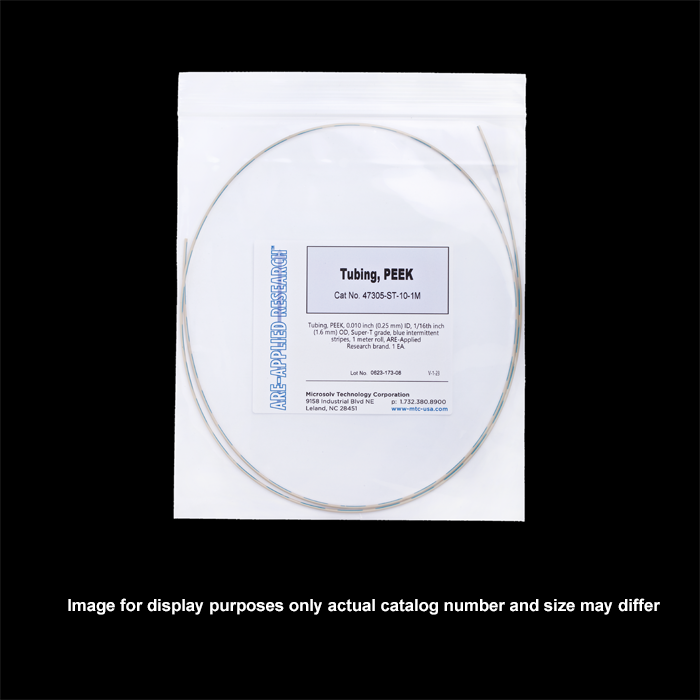 You determine the length of this Ultra-T™ grade (premium) tubing that is extruded from virgin PEEK material without any manufacturing additives. The broken blue stripes are added only to the outside of the tubing, leaving the interior all natural PEEK which eliminates leachables due to color.