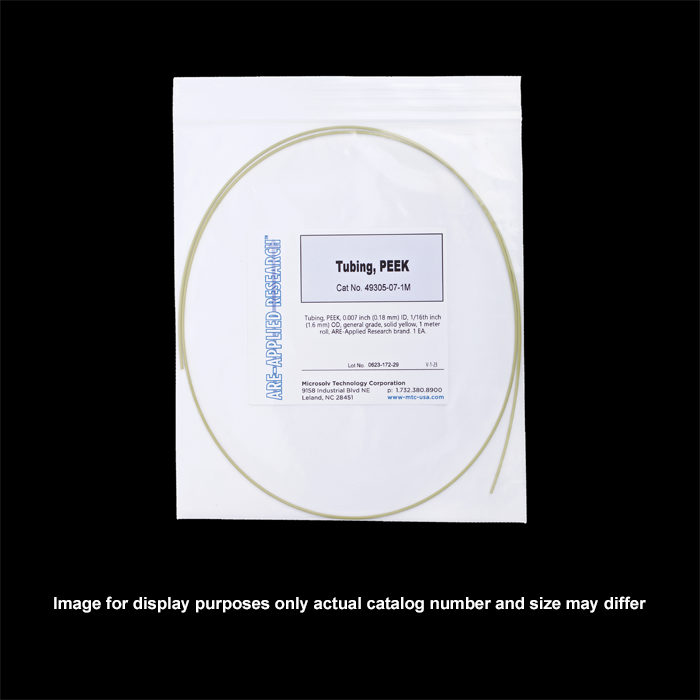 Tubing, PEEK, 0.007 inch (0.18 mm) ID, 1/16th inch (1.6 mm) OD, general grade, solid yellow, 3 meter roll, ARE-Applied Research brand. 1 EA.