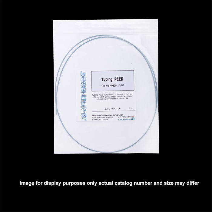 Tubing, PEEK, 0.010 inch (0.25 mm) ID, 1/16th inch (1.6 mm) OD, general grade, solid blue, 10 meter roll, ARE-Applied Research brand. 1 EA.
