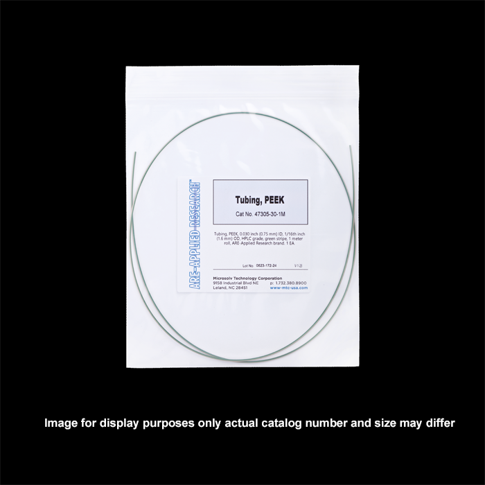 Tubing, PEEK, 0.030 inch (0.75 mm) ID, 1/16th inch (1.6 mm) OD, HPLC grade, green stripe, 3 meter roll, ARE-Applied Research brand. 1 EA.