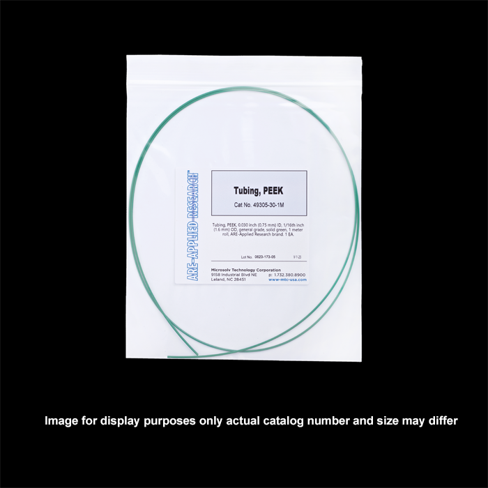 Tubing, PEEK, 0.030 inch (0.75 mm) ID, 1/16th inch (1.6 mm) OD, general grade, solid green, 1 meter roll, ARE-Applied Research brand. 1 EA.