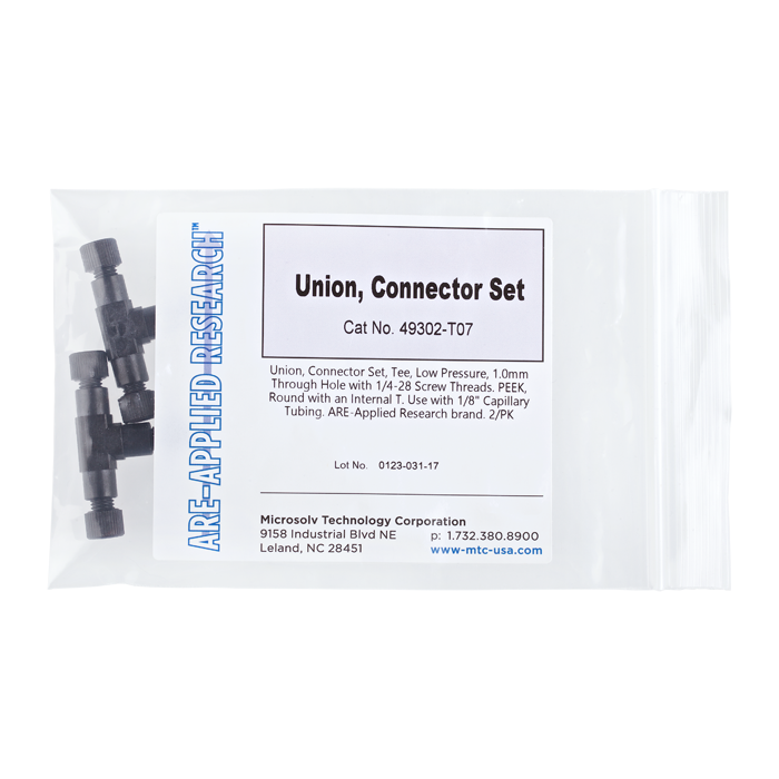 Union, Connector Set, Tee, low pressure, 1.0 mm / 0.040 inch through hole with 1/4-28 screw threads. Carbon PEEK, round with an internal "T". Use with 1/8th inch capillary tubing. ARE-Applied Research brand. Bulk Price.