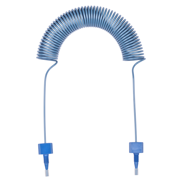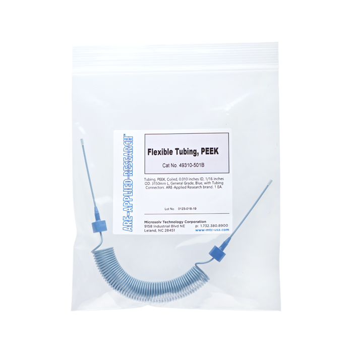 Tubing, PEEK, Coiled, 0.010 (0.25 mm) ID, 1/16th inch (1.6 mm) OD, 3150 mm length, HPLC grade, solid blue, with tubing connectors. ARE-Applied Research brand. 1 EA.