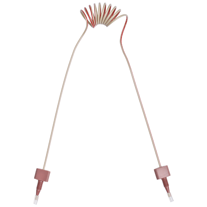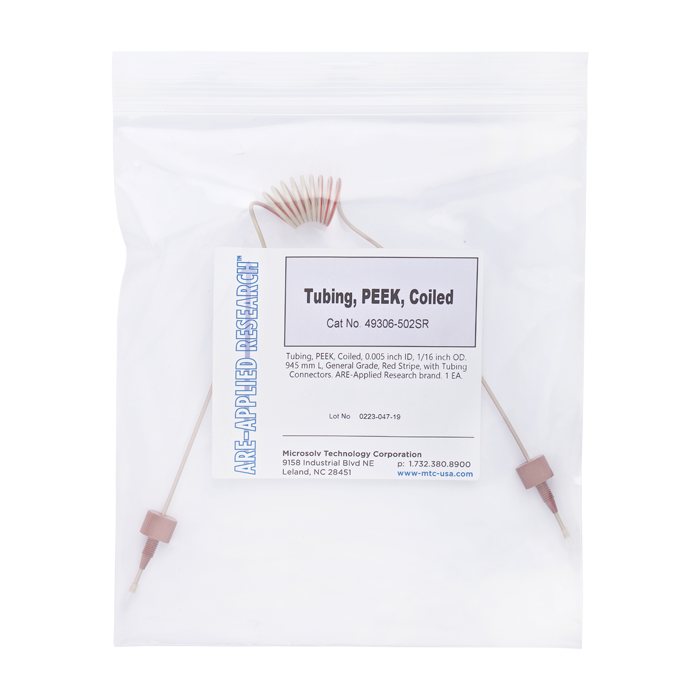 Tubing, PEEK, Coiled, 0.005 (0.13 mm) ID, 1/16th inch (1.6 mm) OD. 945 mm L, HPLC grade, red stripe, with tubing connectors. ARE-Applied Research brand. 1 EA.