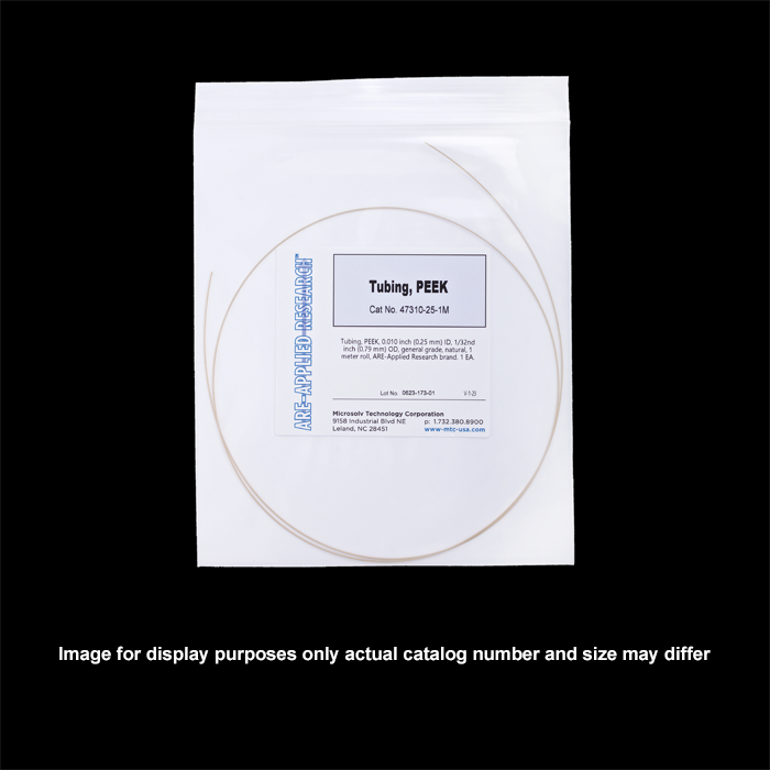 Tubing, PEEK, 0.010 inch (0.25 mm) ID, 1/32nd inch (0.79 mm) OD, general grade, natural, 3 meter roll, ARE-Applied Research brand. 1 EA.