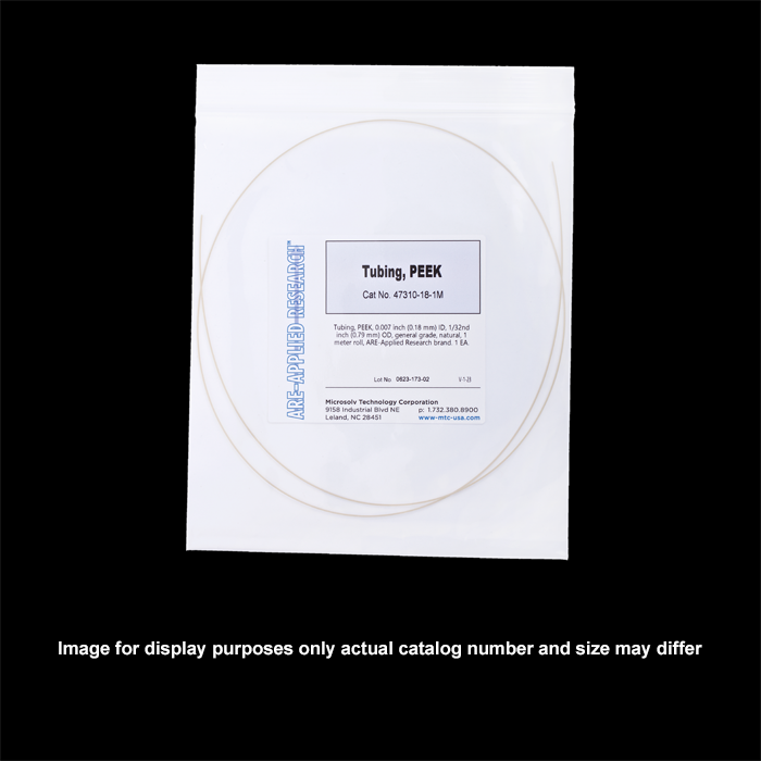 Tubing, PEEK, 0.007 inch (0.18 mm) ID, 1/32nd inch (0.79 mm) OD, general grade, natural, 3 meter roll, ARE-Applied Research brand. 1 EA.