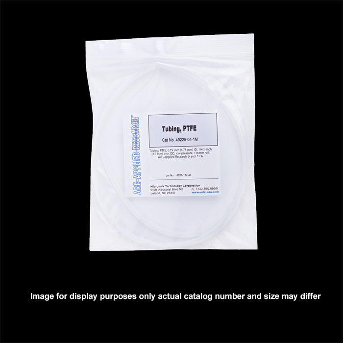 Tubing, PTFE, 0.19 inch (4.75 mm) ID, 1/4th inch (6.4 mm) inch OD, low pressure, 3 meter roll, ARE-Applied Research brand. 1 EA.