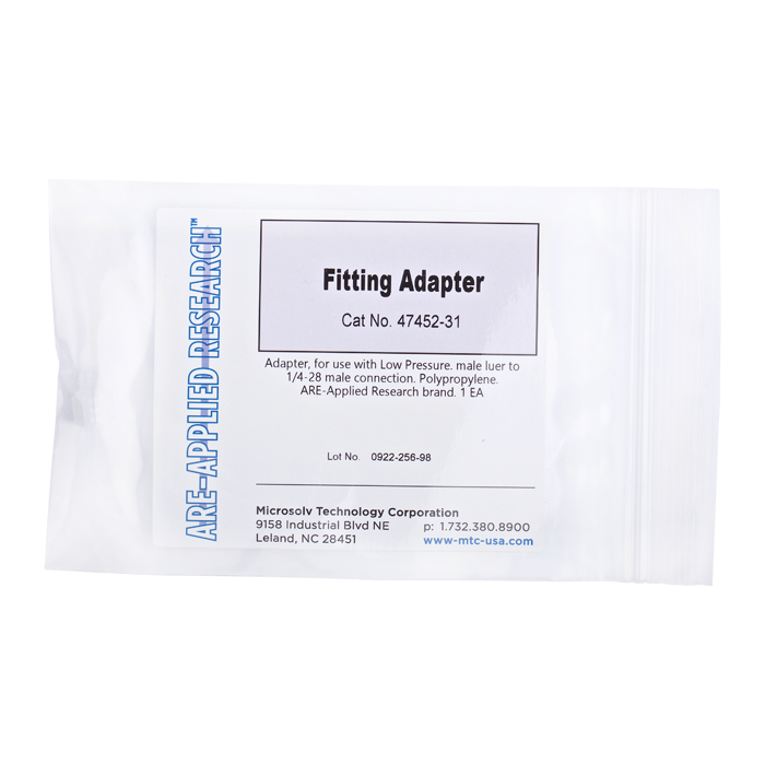 Adapter, for use with low pressure. Male luer to 1/4-28 male connection. Polypropylene. ARE-Applied Research brand. 10/PK.