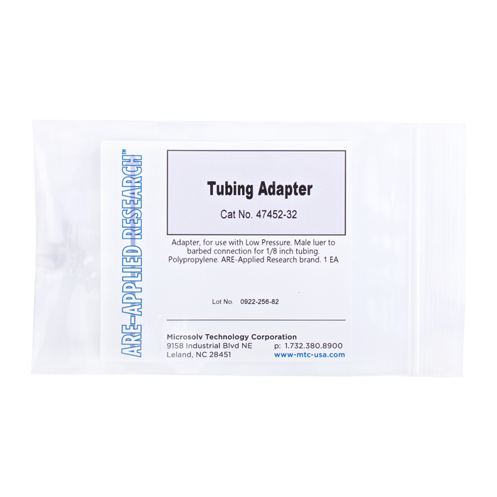 This adapter has a male Luer Lock connection on one side and a hose barb male connection on the other side that accommodates 1/8th inch (3.2 mm) ID tubing.