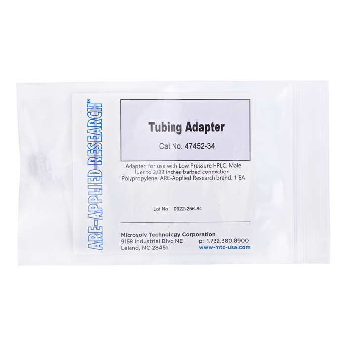 Adapter, for use with low pressure HPLC. Male luer to 3/32 inch barbed connection. Polypropylene. ARE-Applied Research brand. 10/PK.