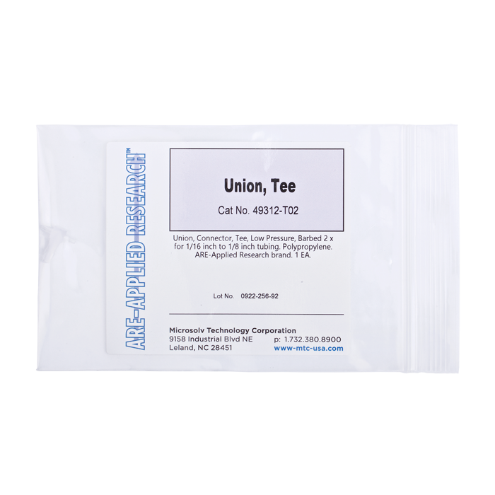 Union, connector, Tee, low pressure, 2 barbed 1/16 inch to one 1/8 inch tubing connection. Polypropylene. ARE-Applied Research brand. 10/PK.