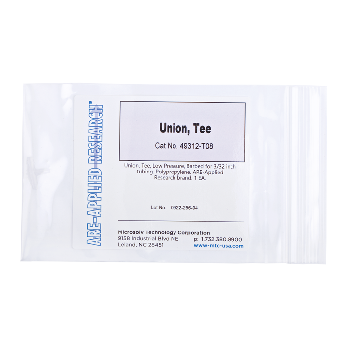 Union, Connector, Tee, low pressure, Barbed for 3/32 inch tubing. Polypropylene. ARE-Applied Research brand. Bulk Price.