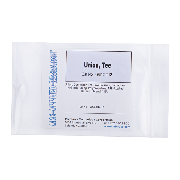 Union, connector, Tee, low pressure, barbed for 1/16 inch tubing. Polypropylene. ARE-Applied Research brand. 10/PK.