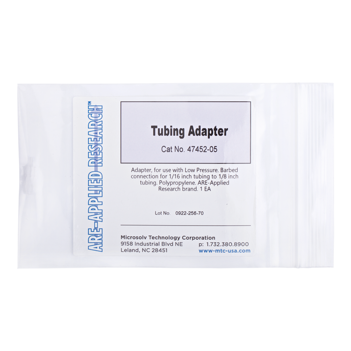 Adapter, for use with low pressure. Barbed connection for 1/16 inch tubing to 1/8 inch tubing. Polypropylene. ARE-Applied Research brand. Bulk Price.