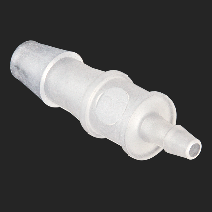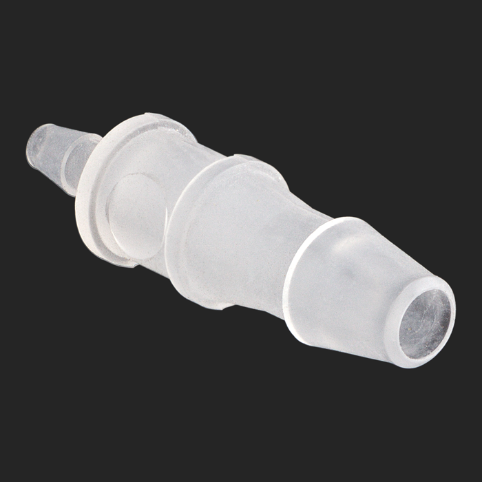 This adapter connects 1/16th inch (1.6 mm) ID tubing to 1/8th inch (3.2 mm) ID tubing when slid over the barbed fittings.
