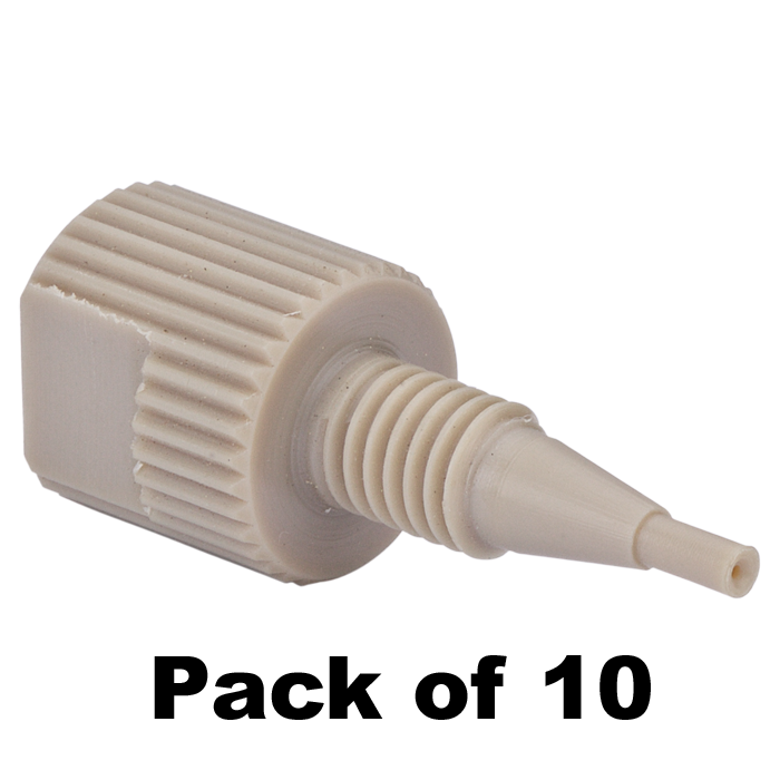 This all-PEEK adapter is very useful for Waters® HPLC instruments or columns. One side has a Waters style female screw thread port and the other side has a Waters style screw thread male connector. Click HERE for the differences between Waters and standard connectors.