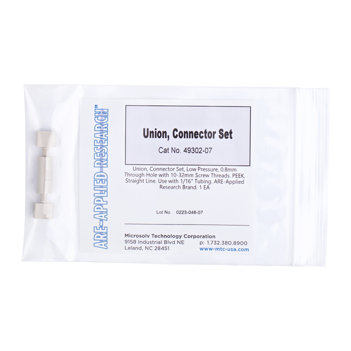 Union, connector set, low pressure, 0.8 mm ( 0.031 inch) through hole with 10-32 mm screw threads. PEEK, straight line. Use with 1/16 inch tubing. ARE-Applied Research brand. Bulk Price.