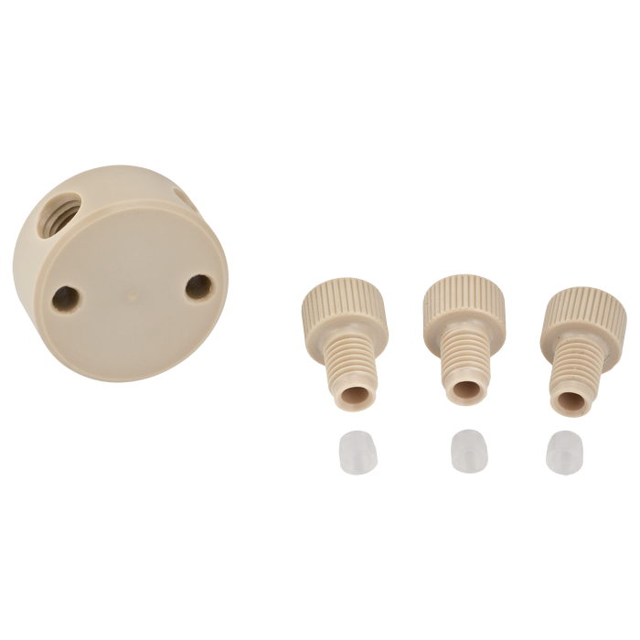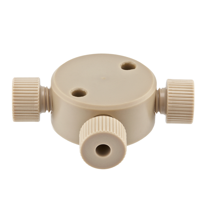 Join three pieces of tubing with similar 1/4-28 connectors. This "three-way T" union allows for 3 pieces of tubing to be joined into one flow or for one flow to be split in the low-pressure zone of HPLC.