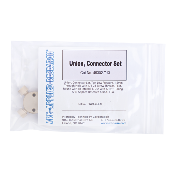 Union, connector set, Tee, low pressure, 1.5 mm / 0.060 inch through hole with 1/4-28 screw threads. PEEK, round with an internal "T". Use with 1/16 inch tubing. ARE-Applied Research brand. 10/PK.
