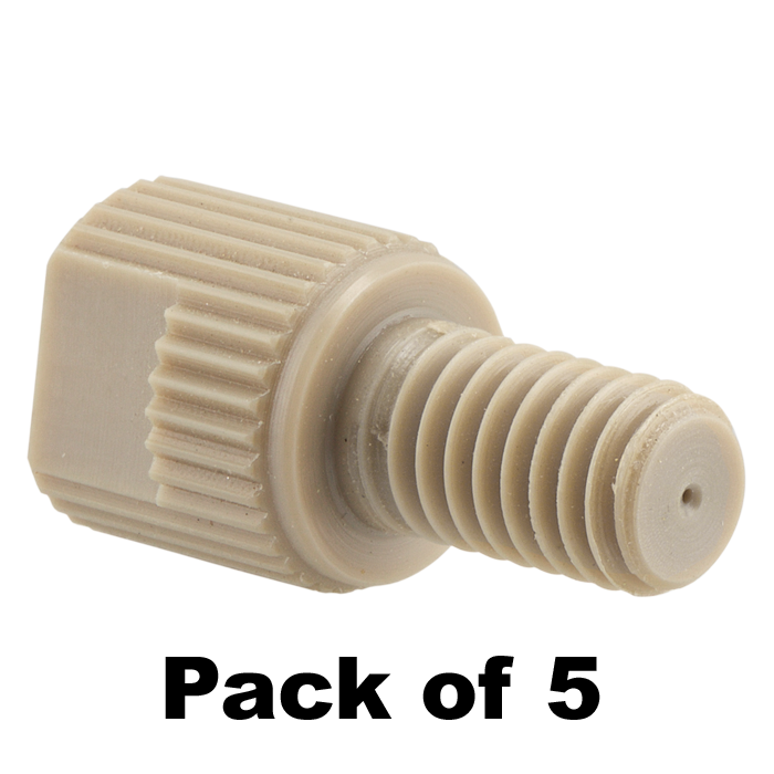 This all-PEEK adapter has a 1/4-28 threaded female port on one side and a European style M6 screw thread male connector on the other side.
