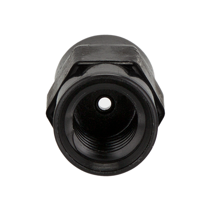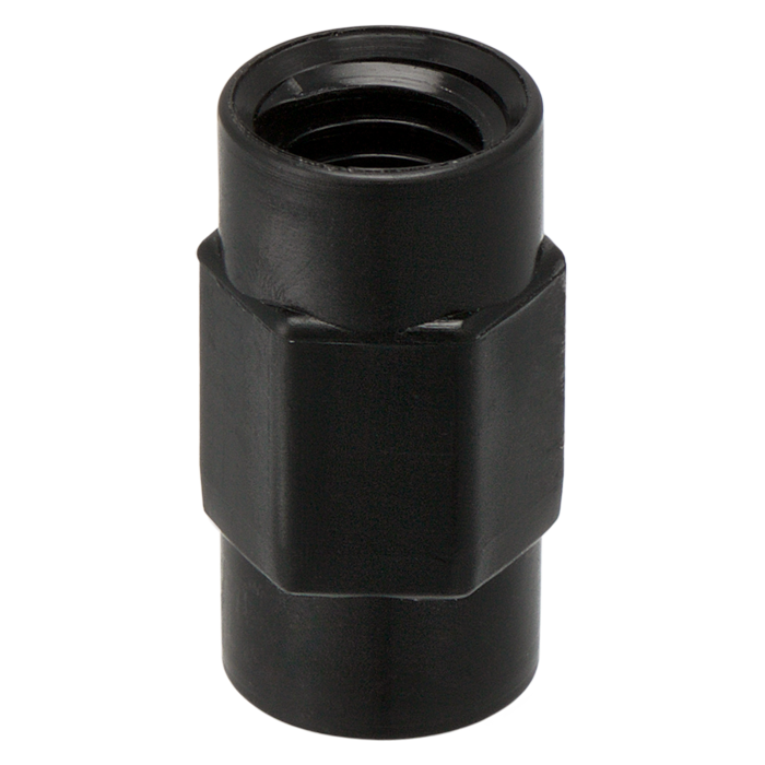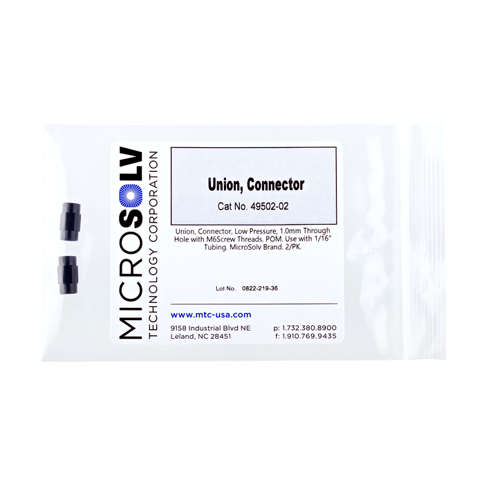 Union, Connector, low pressure, 1.0 mm / 0.040 inch through hole with M6 screw threads. Black POM Endure. Use with 1/16 inch tubing. ARE-Applied Research brand. 10/PK.