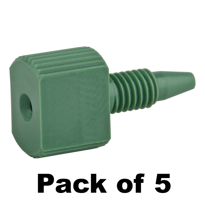 Tubing Connector Fittings, high pressure, one piece, 1/16 inch, PEEK, Green, large Combihead with 10-32 screw threads. Finger or wrench tighten, ARE-Applied Research brand. 5/PK.