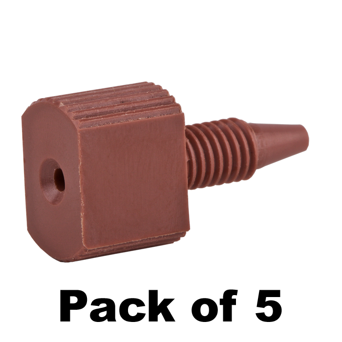 Tubing Connector Fittings, high pressure, one piece, 1/16 inch, PEEK, Red, large Combihead with 10-32 screw threads. Finger or wrench tighten, ARE-Applied Research brand. 5/PK.