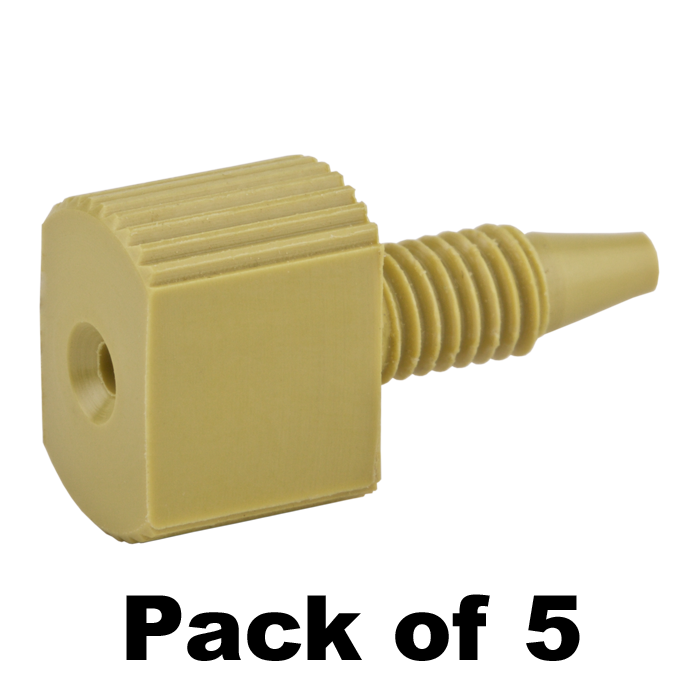 Tubing Connector Fittings, high pressure, one piece, 1/16 inch, PEEK, Yellow, large Combihead with 10-32 screw threads. Finger or wrench tighten, ARE-Applied Research brand. 5/PK.