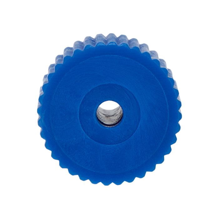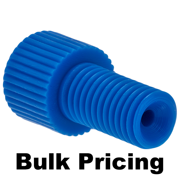Tubing Connector Nuts, low pressure, 1/16 inch, Delrin, Blue with 1/4-28 screw threads, for use with flange free, polymeric tubing. ARE-Applied Research brand. Bulk Price.