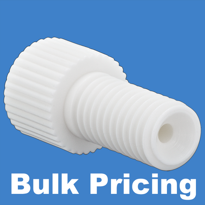 Tubing Connector Nuts, low pressure, 1/16 inch, Delrin, White with 1/4-28 screw threads, for use with flange free, polymeric tubing. ARE-Applied Research brand. Bulk Price.