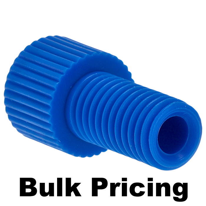 Tubing Connector Nuts, low pressure, 1/8 inch, Delrin, Blue with 1/4-28 screw threads, for use with flange free, polymeric tubing. ARE-Applied Research brand. Bulk Price.