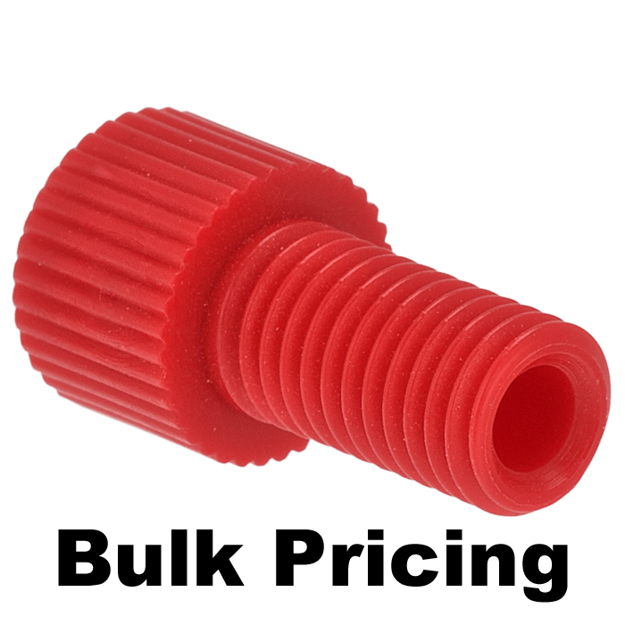 Tubing Connector Nuts, low pressure, 1/8 inch, Delrin, Red with 1/4-28 screw threads, for use with flange free, polymeric tubing. ARE-Applied Research brand. Bulk Price.