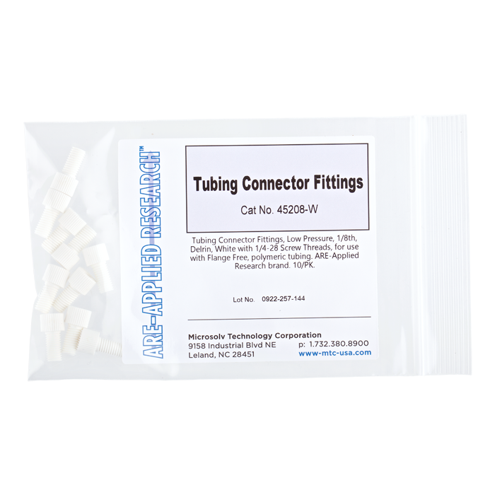 These tubing connector nuts are used to connect 1/8th inch (3.2 mm) OD polymeric tubing in the low pressures zones of HPLC systems and other low pressure, fluidic uses.