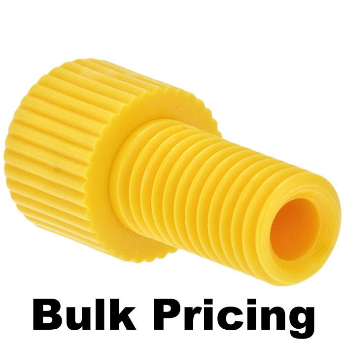 Tubing Connector Nuts, low pressure, 1/8 inch, Delrin, Yellow with 1/4-28 screw threads, for use with flange free, polymeric tubing. ARE-Applied Research brand. Bulk Price.