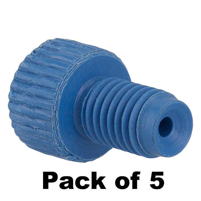 Tubing Connector Nuts, low pressure, 1/16 inch, PEEK, Blue with 1/4-28 screw threads, for use with flange free, polymeric tubing. ARE-Applied Research brand. 5/PK.
