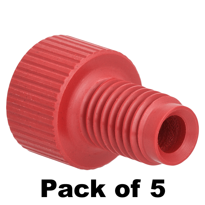 Tubing Connector Nuts, low pressure, 1/8 inch, PEEK, Red with 1/4-28 screw threads, for use with flange free, polymeric tubing. ARE-Applied Research brand. 5/PK.