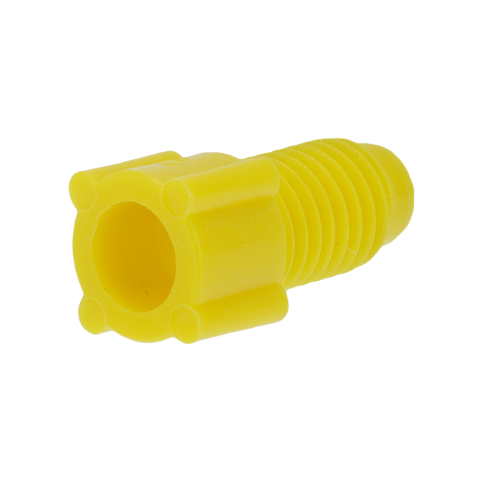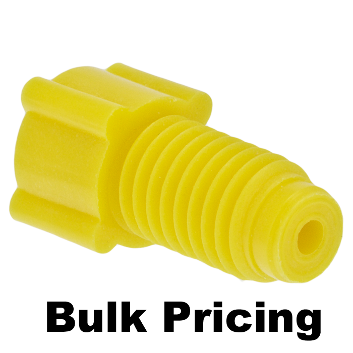 Tubing Connector Nuts, low pressure, 1/16 inch, Polypropylene, Yellow with 1/4-28 screw threads, for use with flanged, polymeric tubing. ARE-Applied Research brand. Bulk Price.