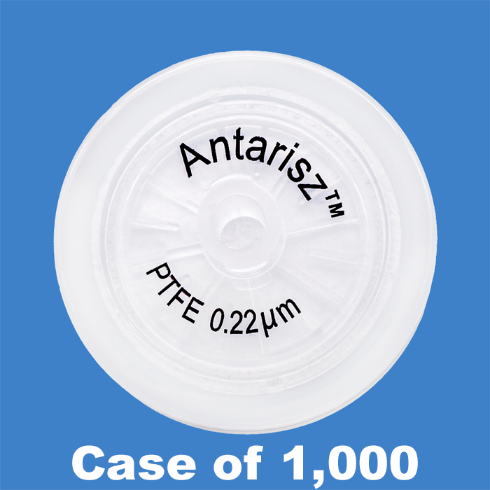 Syringe Filters, 25 mm, PTFE, Hydrophobic, 0.22 um Pore Size. Translucent Polypropylene, Antarisz Brand. 1,000/CS